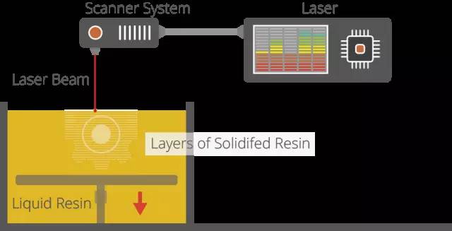 該技術以光敏樹脂為原料,將計算機控制下的紫外激光按預定零件各分層截面的輪廓為軌跡對液態(tài)樹脂逐點掃描,使被掃描區(qū)的樹脂薄層產(chǎn)生光聚合反應,從而形成零件的一個薄層截面。當一層固化完畢,移動工作臺,在原先固化好的樹脂表面再敷上一層新的液態(tài)樹脂以便進行下一層掃描固化。新固化的一層牢固地粘合在前一層上,如此重復直到整個零件原型制造完畢。